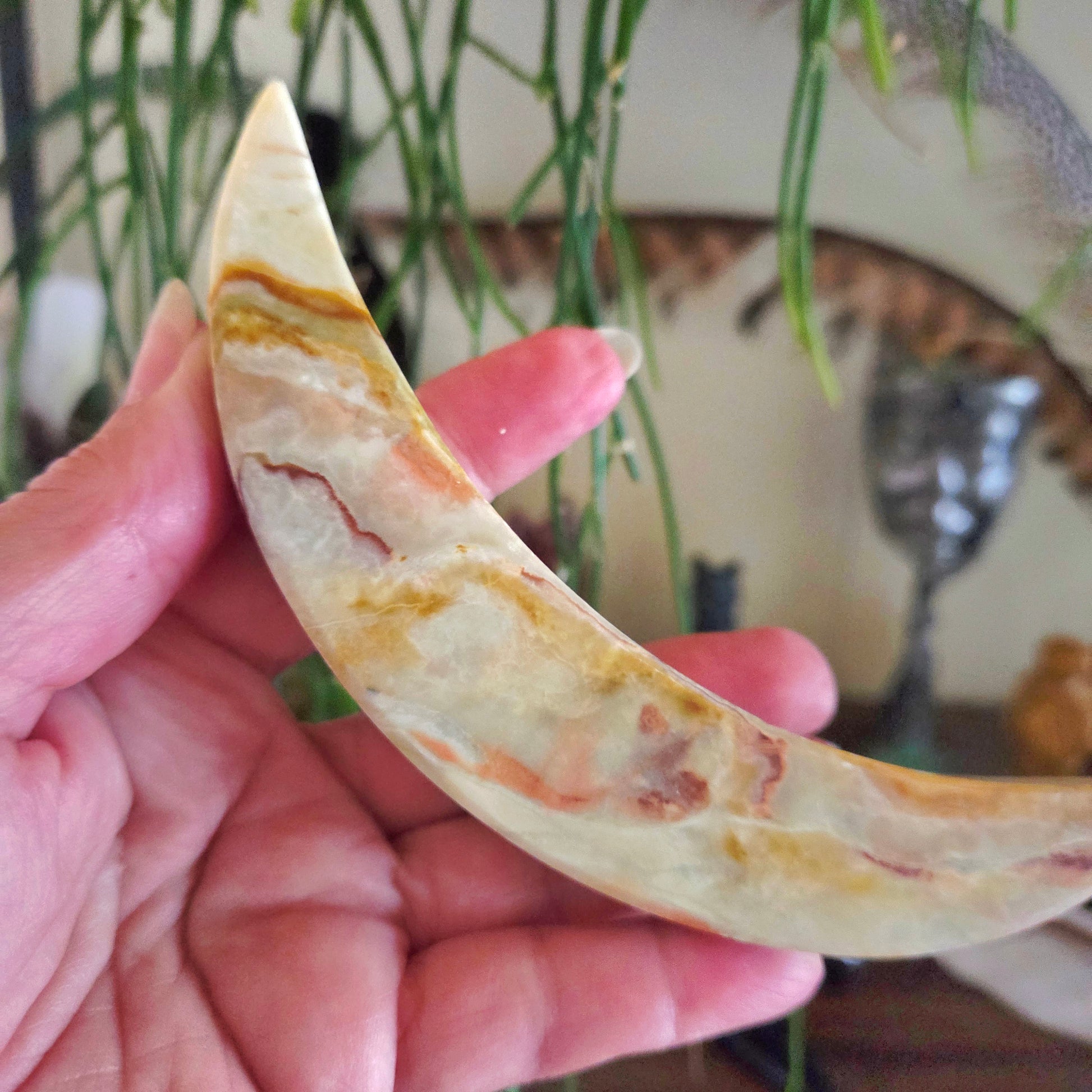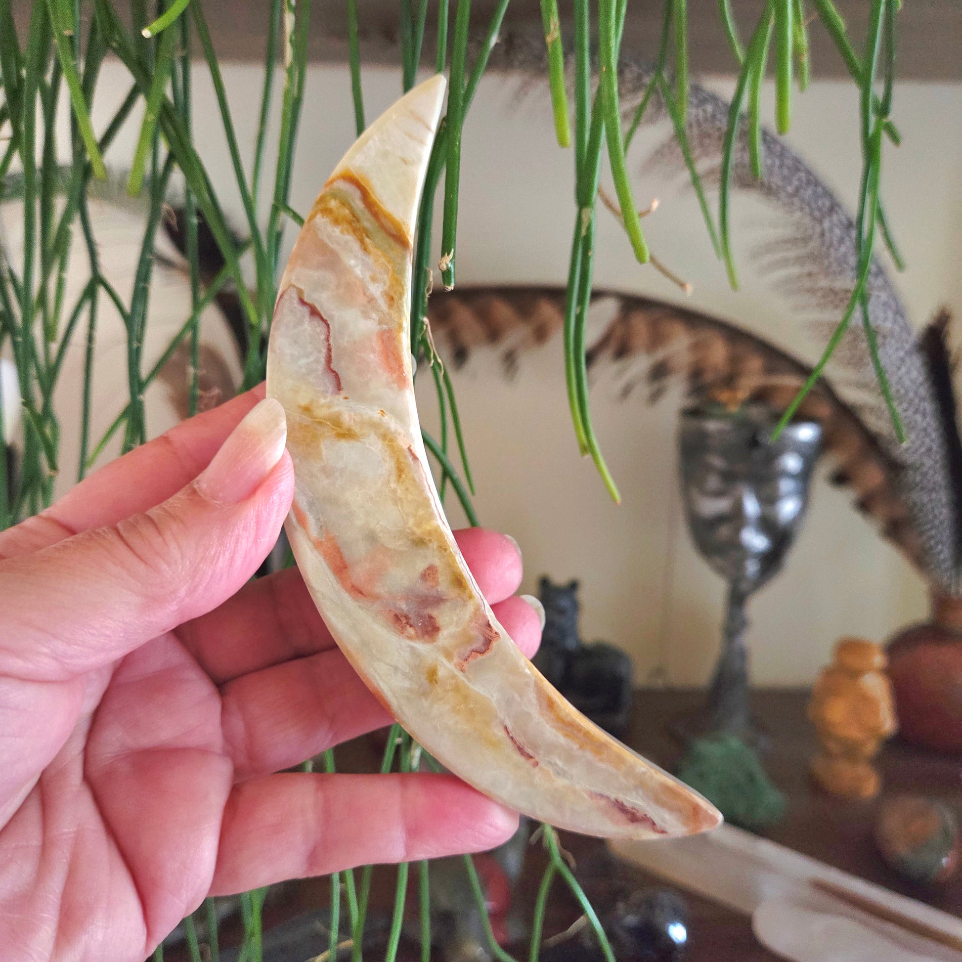 Green Onyx is a stone of strength, renewal, and emotional balance. Shaped into a gentle moon, it symbolizes growth, new beginnings, and emotional healing — guiding you to release the old and welcome positive transformation.